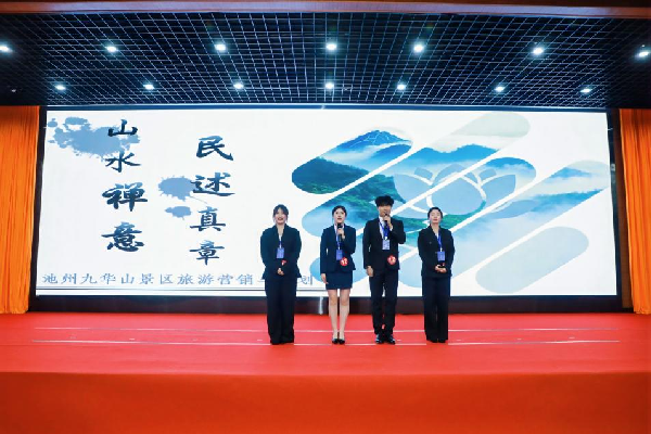 决赛现场,来自沪皖高校的20余支团队同场竞技。我院参赛团队以《山水禅意·民述真章——池州九华山旅游目的地营销策划方案》为题,深入调研了池州市九华山旅游景区的发展现状和市场分析,通过结合新媒体营销知识与大数据AI技术,探索出一条九华乡村文旅发展新路径。