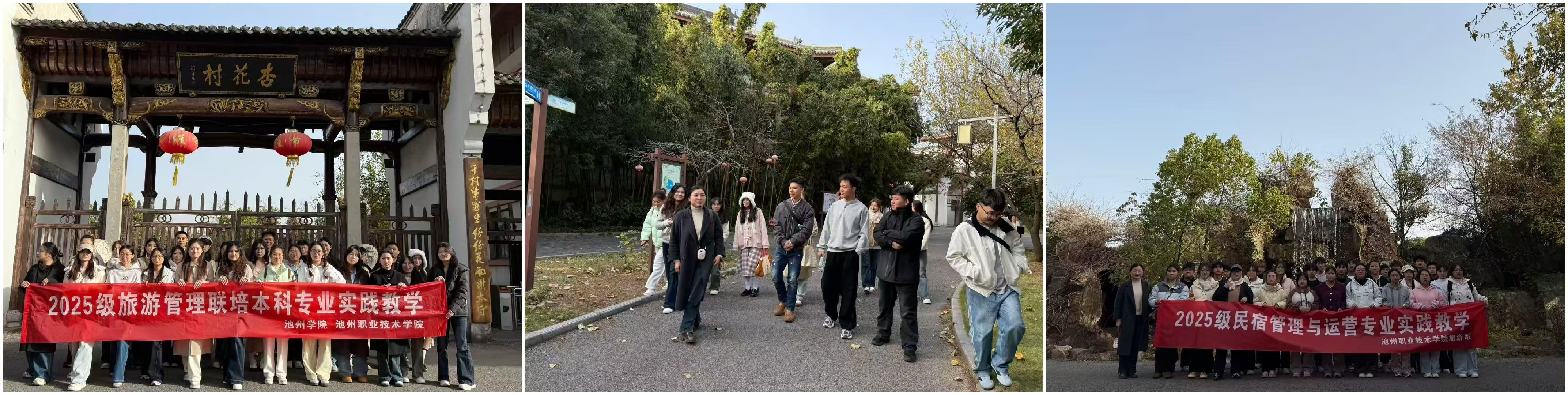 20251127日下午,池州职业技术学院旅游系潘庆、焦玟两位教师带领2025级旅游管理专升本班及民宿管理与运营班学生,赴池州杏花村景区开展联合课程实践。