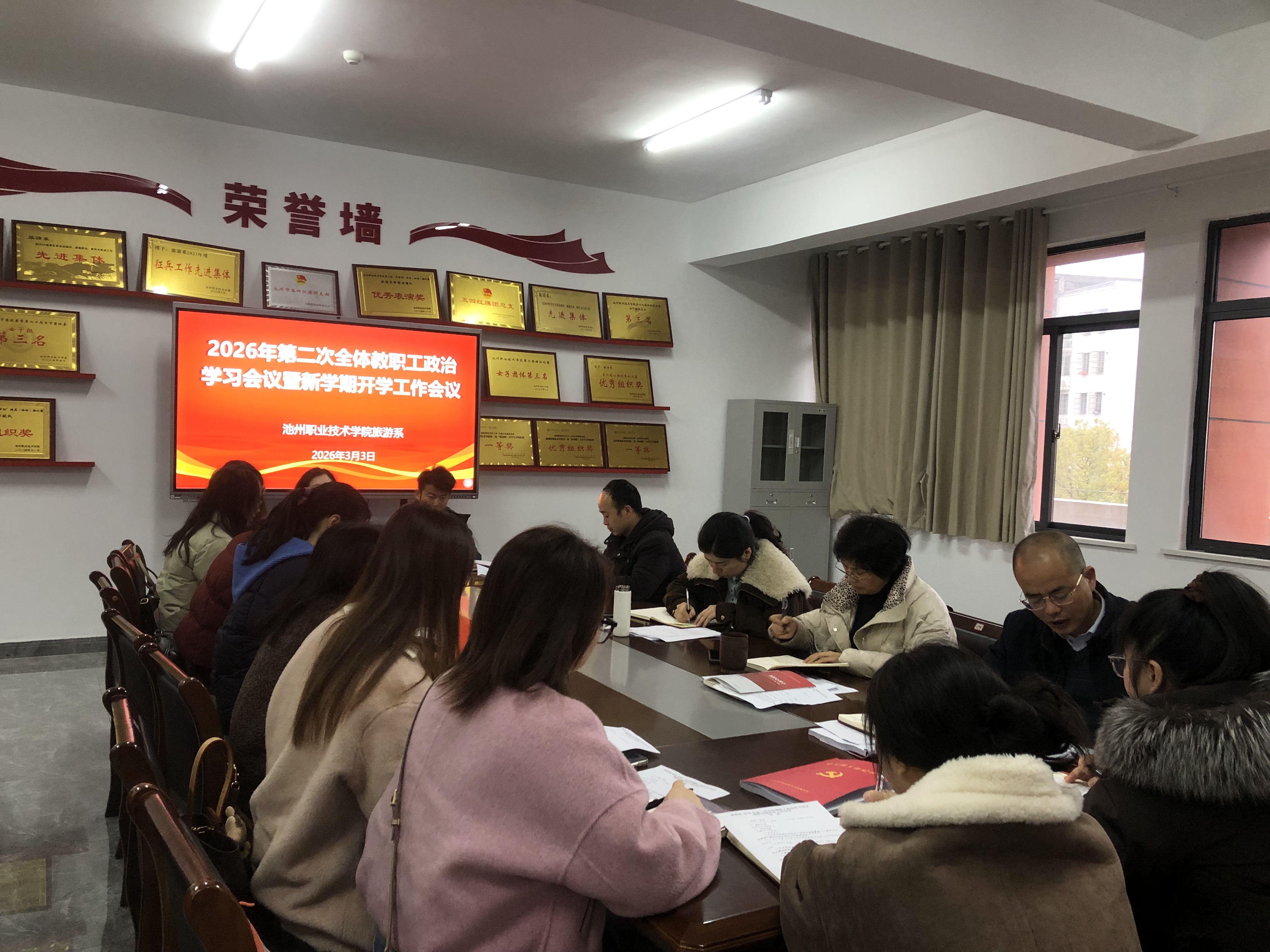 为深入贯彻落实党的二十届四中全会精神和全国、全省教育工作会议精神,全面推进学院“建高创大”任务落实到系部,扎实做好新学期各项工作,3月3日上午,旅游系召开2026年第二次全体教职工政治学习会暨新学期开学工作会议,系党总支书记吕秋水主持会议,系主任颜红及全体教职工参加会议。