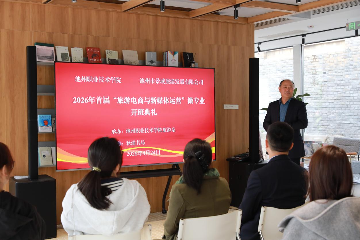 4月24日上午,池州职业技术学院旅游系“旅游电商与新媒体运营”微专业开班典礼在池州老池口风景区顺利举行。学院党委委员、安徽交通职业学校党委书记朱和记、旅游系主任颜红、池州景域旅游发展有限公司相关负责人及微专业全体师生参加开班仪式。