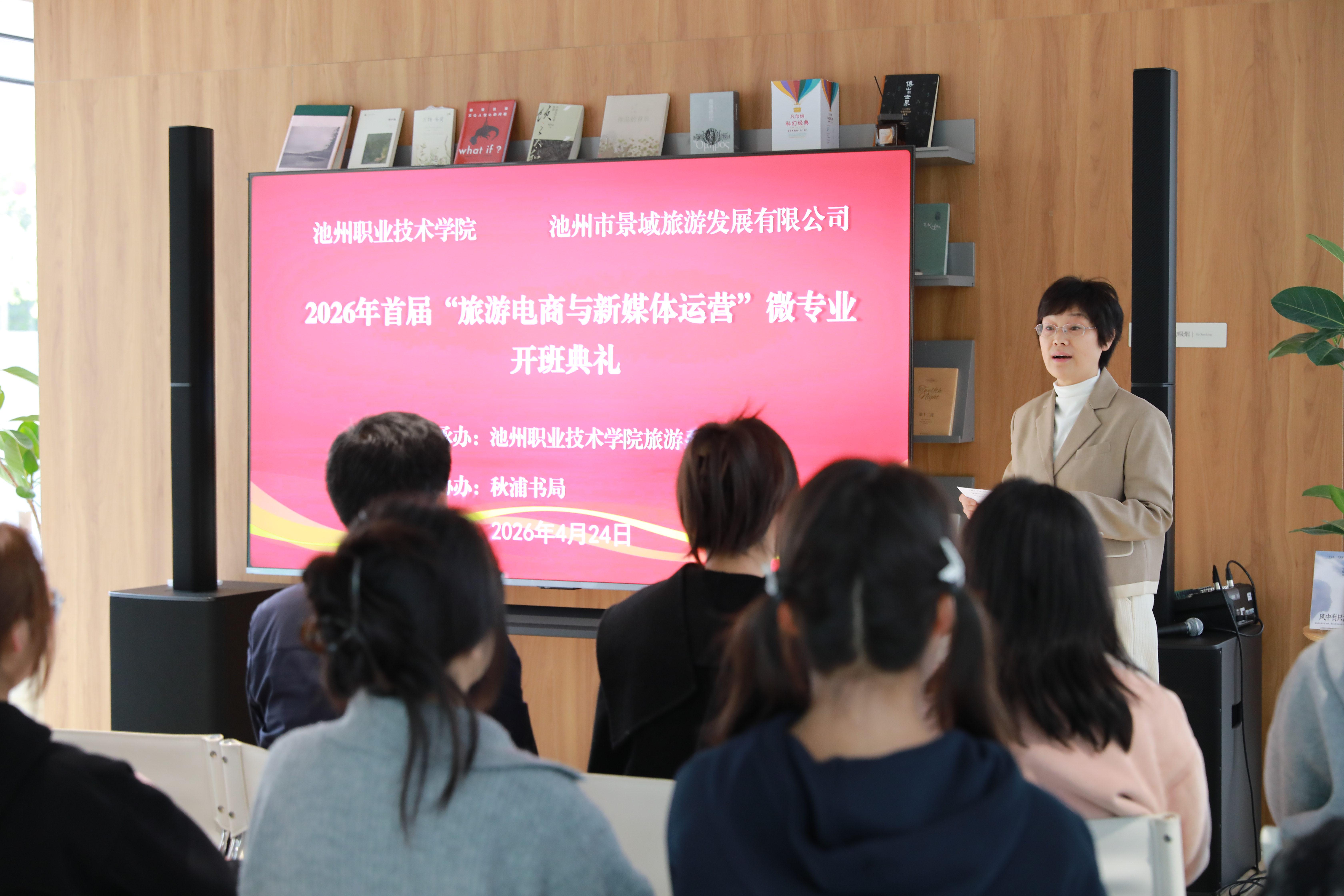 学院党委委员、安徽交通职业学校党委书记朱和记宣布首届“旅游电商与新媒体运营”微专业开班。随后,在秋浦书局玻璃大厅开展了第一次课程。